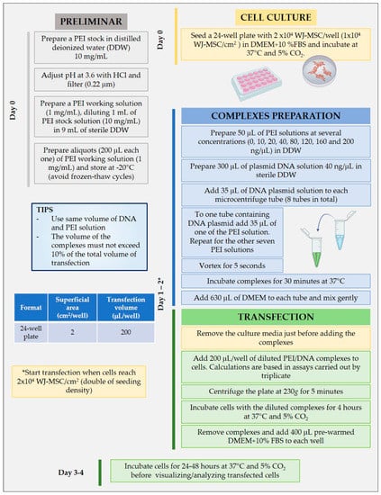 Detailed protocol used to transfect Wharton’s jelly-mesenchymal stem cells (WJ-MSC) with PEI in 24-well plates by triplicate.