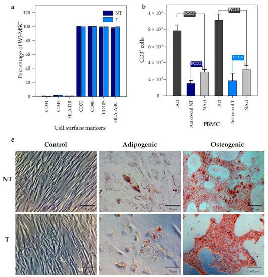 Following the international criteria established by the Society for Cell and Gene Therapy (ISCT) to define multipotent mesenchymal stromal cells, we evaluated the effect of PEI transfection on WJ-MSC according to three identity factors: adherence to plastic in standard culture conditions, specific surface antigen (Ag) expression, multipotent differentiation potential (osteoblasts and adipocytes) demonstrated by in vitro cell culture staining [] and one parameter of biological activity: the immunomodulatory properties. WJ-MSC transfected with PEI/DNA at an N/P ratio of 14 were evaluated. First, the presence of characteristic surface cell markers was analyzed by flow cytometry. WJ-MSC expressed no hematopoietic markers (CD34, CD45, and HLA-DR) in both transfected (T) and non-transfected (NT) cells (≤2%, Figure 4a). The presence of identity markers for MSC (CD73, CD90, and CD105) was positive (≥95%) in both transfected and non-transfected WJ-MSC.