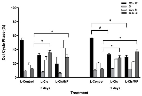 The progression of the cell cycle was analyzed 5 days after treatment with L-Cis or L-Cis/MF, finding that L-Cis/MF arrests the cancer cells at the G2/M phases, while the impact of L-Cis on these phases was not as notable. At 9 days, however, the L-Cis/MF-induced arrest of HeLa cells at G2/M was not different from the effect produced by the control group or L-Cis. On the other hand, L-Cis/MF generated a significant increase (versus the controls) in the Sub-G0 phase and in apoptosis, and in both cases the elevated level was sustained throughout the 9-day experiment, indicating greater cell death.