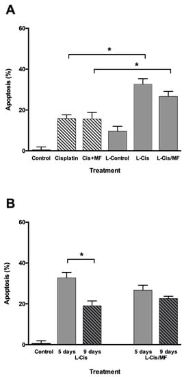The level of apoptosis found at day 5 was compared to that at day 9 post-treatment in each group. At the latter time, the level of apoptotic cells produced by L-Cis was significantly lower, while that generated by L-Cis/MF did not significantly change, suggesting a greater apoptotic effect by the L-Cis/MF system.