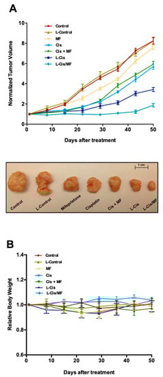 Therapeutic efficacy was studied in vivo using a mouse model with a xenotransplant of HeLa cells and different 3-week treatments (Figure 6). The drug-loaded liposomes (L-Cis and L-Cis/MF) gave the best results. L-Cis/MF produced a significant decrease in tumor growth compared to L-Cis, Cis, MF and Cis/MF. After 50 days of initiating the 3-week treatments, L-Cis/MF proved capable of controlling tumor growth, evidenced by a final tumor volume equal to the initial volume. In relation to the initial tumor volume, an increase was found in all the other groups, being around 8-fold and 6-fold greater with the control and the conventional Cis/MF treatment, respectively (Figure 6A). Regarding possible systemic toxicity, no significant change in animal body weight was observed during the experiment (Figure 6B).