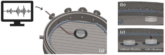 (a) overview of an initiated chemical vapor deposition (iCVD) reactor with inserted speaker and petri dish. (b) cross section of the setup when performing a flat hearth deposition. (c) cross section of the setup when performing depositions with speakers. Both petri dishes are placed on speakers but only one vibrated during the deposition.