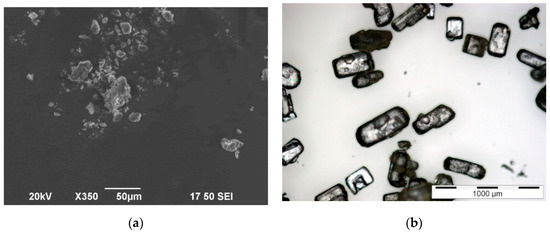 (a) Scanning electron microscope image of the magnesium citrate powder. (b) Light microscope image of the aspirin powder.