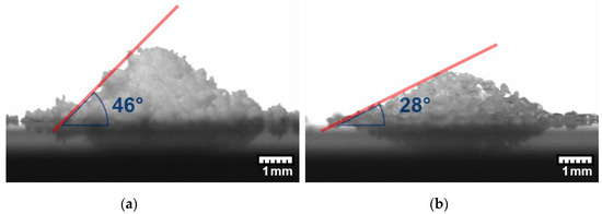 The grain size and shape of the two powders, magnesium citrate and aspirin, were observed using a microscope. In Figure 2a, the magnesium citrate powder is shown. The particle shape is irregular and the grain size is small with a diameter of (8 ± 9) µm. The particles agglomerate into bigger clusters, which is typical for hygroscopic cohesive powders, such as magnesium citrate. The angle of repose of the magnesium citrate (Figure 3a) was measured to be (46 ± 2)°, suggesting poor flowability [34]. In comparison, aspirin (Figure 3b) has a mean grain size of (200 ± 100) µm. The measured angular of repose of the aspirin (Figure 3b) is (28 ± 2)° suggesting the aspirin particles would have excellent flow properties. The particles are well defined, easily flowing and crystalline. The magnesium citrate and aspirin proved to be of the group C and the group B of the theory of Geldart, respectively [26].