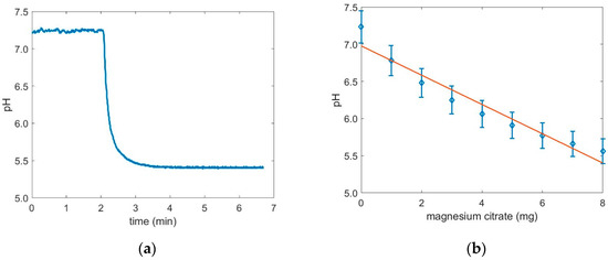 (a) Variation of pH in time of dissolving magnesium citrate. (b) Calibration curve to link the dissolved magnesium citrate with a pH value.