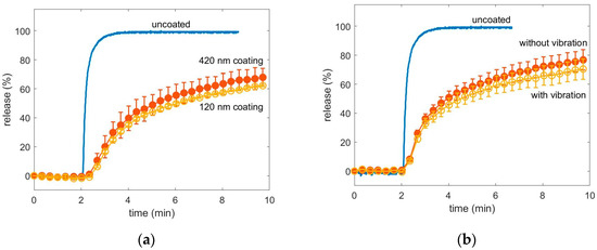 (a) Release curve of magnesium citrate coated with a nominal coating thickness of 420 nm and a nominal coating thickness of 120 nm polymer of p-EGDMA. Samples were placed on the reactor bottom as in Figure 1b. (b) release curve of magnesium powder coated with and without vibration both with a nominal thickness of 210 nm. Samples were placed on speakers as in Figure 1c.