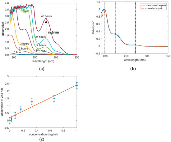 (a) Representative absorption spectra of coated aspirin powder. In time the absorption bands of aspirin increase due to the present of dissolved aspirin. (b) Scaled absorption spectra of uncoated aspirin dissolved within 10 min and coated aspirin released within 5 h. The absorption bands are alike, indicating a retention of chemical structure during the coating process. (c) Calibration curve, which links the peak height of the absorption band at 272 nm to the concentration of aspirin in the water.