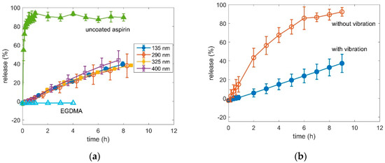 The release of the aspirin was measured with optical absorption measurements. In Figure 7a, a representative of the absorption spectra of coated aspirin in time steps are plotted. With time the typical absorption bands of aspirin at 193 nm, 225 nm and 277 nm rise [35]. Comparing the spectra of uncoated aspirin dissolved within 10 min with coated aspirin released in 5 h, the absorption bands positions and heights are alike (Figure 7b). This indicates, that the release of coated powder is retarded but the chemical structure of aspirin retained during the vibration and the deposition. After approximately 10 h a shoulder at 303 nm appears and starts to increase. This peak is attributed to the formation of salicylic acid. In water, aspirin gradually hydrolyses to acetic and salicylic acids [36]. The height of the absorption band at 277 nm was used in the calibration and is plotted versus the aspirin concentration in Figure 7c. The calibration has approximately a linear trend (linear regression with a R2 of 0.94) and was used further to calculate the release, which is the percentage of powder weight that already dissolved. The release of uncoated aspirin is within 30 min at 80% and converges to 85%. The p-EGDMA coating itself has no absorption at 273 nm. The aspirin powder coated with a nominal thickness of 135 nm, 290 nm, 325 nm and 400 nm in the flat hearth deposition is retarded compared to the uncoated aspirin, as it can be seen in Figure 8a. The time where the dissolution of the uncoated powder reached 1/e was calculated with τuc = (0.13 ± 0.09) h. The time where the release of the powder coated with 135 nm of nominal coating thickness exceeded 1/e was τc = (7.5 ± 0.9) h. The resulting delay factor was calculated with τu/τuc = 54 ± 5. For the aspirin powders coated with 290 nm, 325 nm and 400 nm the delay factor were 58 ± 10, 58 ± 4 and 45 ± 10, respectively. The release time of the coated aspirin differs only marginally between different coating thicknesses. The release properties in a flat hearth iCVD deposition cannot be tuned with the deposition thickness. The aspirin does not agglomerate to bigger clusters and the hypothesis of a diffusion limitation to inner particles within the clusters cannot be applied. The typical problem of a flat hearth deposition is the inhomogeneous gas–solid contact. If particles are in contact with the reactor wall or with other particles, the gas cannot reach this surface area. As schematized in Figure 6b, the weak point of the coating is the contact-area from a particle to a surface. Although the upper part of the particle can be coated thicker and thicker, the weak point does not change which would explain why the thickness of the coating has no influence on the release.