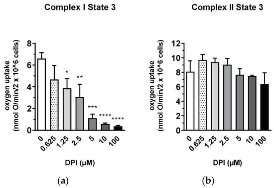 Inhibitory effect of diphenyleneiodonium chloride (DPI) on Complex I mitochondrial function in permeabilized MG-63 cells. (a) Effects of different concentrations of DPI on Complex I-linked State 3. * p < 0.05, ** p < 0.01, *** p < 0.001, and **** p < 0.0001 compared to the control. (b) Effects of different concentrations of DPI on Complex II-linked State 3. Data is represented as means + SD (error bars) (n = 3). One-way ANOVA followed by multiple comparison post-hoc Fisher’s LSD test.