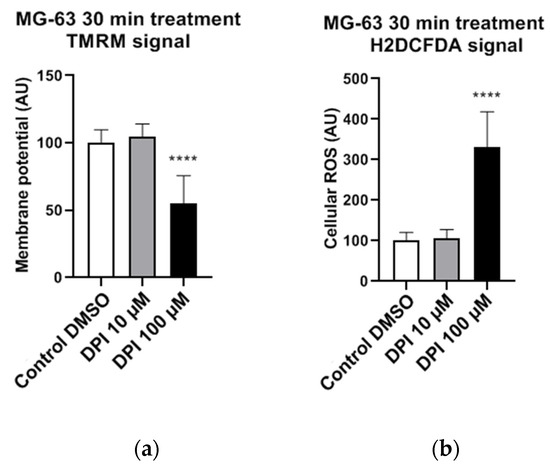 Effects of 30 min 10 µM and 100 µM diphenyleneiodonium chloride (DPI) in nonpermeabilized MG-63 cells, inducing a drop in mitochondrial membrane potential and a burst of reactive oxygen species (ROS) production on higher concentrations. The data is displayed in arbitrary units (AU). (a) Effects of 10 µM and 100 µM DPI on mitochondrial membrane potential. (b) Effects of 10 µM and 100 µM DPI on cellular ROS levels. Data is represented as means + SD (error bars) (n = 24; each point was obtained by analyzing 2–4 single cells. **** p < 0.0001; one-way ANOVA followed by multiple comparison post-hoc Fisher’s LSD test.).
