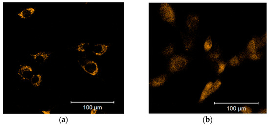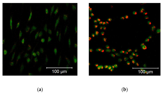 Release of the mitochondrial ROS-sensitive CM-H2XRos fluorescent probe to the cytoplasm is induced by a 100 µM diphenyleneiodonium chloride (DPI) treatment of MG-63 cells. (a) Control group treated with 0.5% vol. DMSO. (b) Group exposed to a 100 µM DPI concentration. The images were taken with a Zeiss LSM 510 microscope, 10× objective, 5 μM CM-H2XRos probe concentration.
