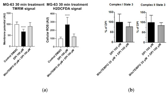 Cellular ROS may come from different sources, including mitochondria. To examine whether the observed increase in cytoplasmic ROS originated from the mitochondria, we stained cells with a mitochondria-specific ROS-sensitive fluorescent probe and treated the cells for 30 min with 100 µM DPI (Figure 3). We observed that the ROS-sensitive fluorescent probe accumulated in the intact mitochondria of the control group (Figure 3a), whereas, in response to the DPI treatment, the fluorescent probe was released in the cytoplasm (Figure 3b), thus suggesting a mitochondrial origin of the ROS. Additionally, we stained the cells with CM-H2XRos together with a nuclear dye (NucSpot® 650), and we did not find staining by CM-H2XRos in the nuclei of the control cells (Figure S2). To further prove the mitochondrial origin of cytoplasmic ROS, we tested whether the increase in ROS can be reduced by mitochondria-targeted antioxidant MitoTEMPO. If an excessive generation of ROS contributes to mitochondrial dysfunction, the treatment with MitoTEMPO should prevent a drop in membrane potential as well. Indeed, the LSM analysis showed that the treatment of MG-63 with MitoTEMPO abolished the increase in cytoplasmic ROS levels in DPI-treated cells and prevented the drop in the mitochondrial membrane potential (Figure 4a). The experiment performed with permeabilized cells with an excess of substrate MitoTEMPO did not affect the mitochondrial respiration recorded in the presence of 100 µM DPI (Figure 4b).