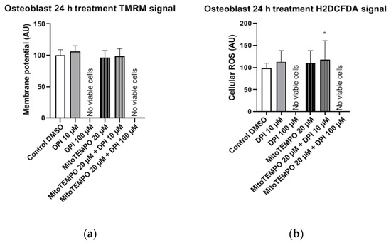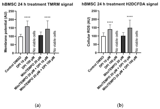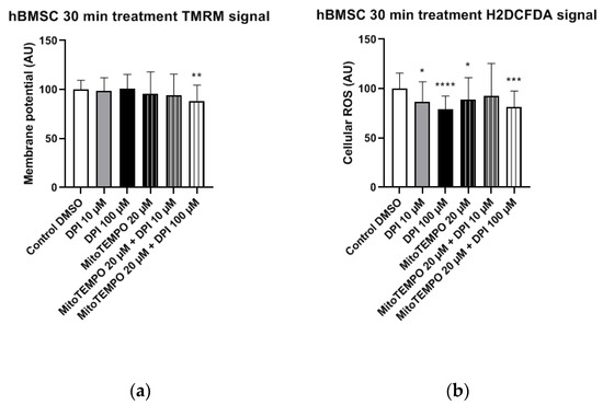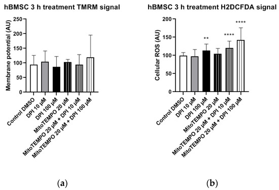 In hBMSCs, no statistically significant changes in the mitochondrial membrane potential were observed in any of the treatment groups compared to the control group (Figure 9a). The treatment of hBMSCs with 100 µM DPI and combined treatments with 20 µM MitoTEMPO and 10 µM or 100 µM DPI led to significant increases in the cellular ROS levels compared to the control group (Figure 9b). This suggests the onset of DPI effects on the mitochondria, which were not prevented but, rather, exacerbated in a combined treatment with MitoTEMPO and 100 µM DPI compared to the treatment with 100 µM DPI alone (Figure 9b).