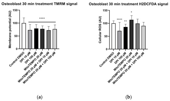 In osteoblast-like cells, all treatments resulted in significantly reduced mitochondrial membrane potential compared to the control group (Figure 7a). Furthermore, treatments with 10 μM and 100 μM DPI significantly reduced the cellular ROS levels compared to the control group (Figure 7b). This reveals that, similarly to undifferentiated hBMSCs, DPI showed inhibitory properties in predifferentiated cells. The treatment with 20 μM MitoTEMPO caused an increase of ROS compared to the control group, whereas the combined treatments exhibited no differences in the control group in these cells (Figure 7b).