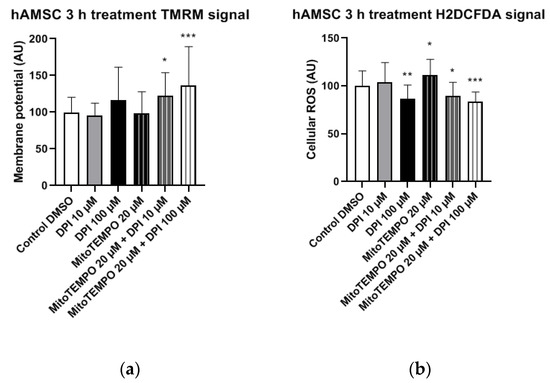 Mitochondrial membrane potential and cellular ROS levels 3 h after the treatment of hAMSCs with diphenyleneiodonium chloride (DPI) and MitoTEMPO. (a) Changes in mitochondrial membrane potential. (b) Changes of cellular ROS levels; high concentrations of DPI induce an increase of the ROS via the mitochondrial effects. Data is represented as means + SD (error bars) (n = 23; each point was obtained by analyzing 2–4 single cells. * p < 0.05, ** p < 0.01, and *** p < 0.001; one-way ANOVA followed by multiple comparison post-hoc Fisher’s LSD test.