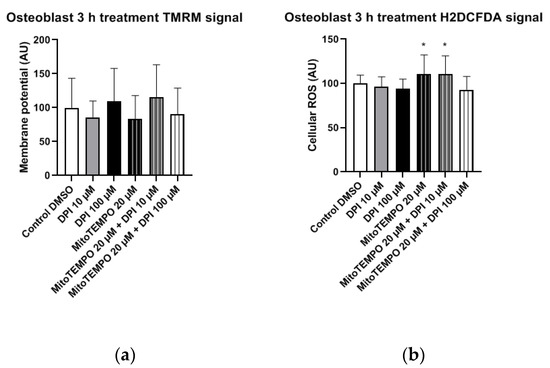In osteoblast-like cells, no statistically significant differences in mitochondrial membrane potential changes were observed in any of the treatment groups compared to the control group (Figure 10a). However, the treatment with 20 µM MitoTEMPO, as well as the combined treatment with 20 µM MitoTEMPO and 10 µM DPI caused a statistically significant increase in the cellular ROS levels compared to the control group (Figure 10b).