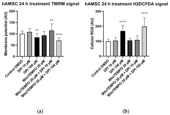 In hAMSCs, we observed a significant increase in the mitochondrial membrane potential in the combined treatment groups with 20 µM MitoTEMPO and either 10 µM or 100 µMDPI (Figure 8a). A similar trend of increased mitochondrial membrane potential was observed in the 100 µM DPI group, but the difference to the control group was not statistically significant (Figure 8a). The treatment of hAMSCs with 100 µM DPI and combined treatments of hAMSCs with 20 µM MitoTEMPO and 10 µMor 100 µM DPI resulted in significantly decreased cellular ROS levels compared to the control group (Figure 8b). This could imply a presence of crosstalk between the mitochondria and NOX in hAMSCs, as the decrease in ROS levels was accompanied by an increase in the mitochondrial membrane potential. Paradoxically, the treatment with 20 µM MitoTEMPO caused a significant increase in cellular ROS levels compared to the control group (Figure 8b).