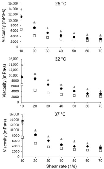 Viscosity of PEITC carbomer gel (gray triangles), blank carbomer gel (white squares), and commercially available Alocane gel (black circles) at 25, 32, and 37 °C. All samples run in triplicate.