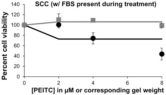 Dose-responses with treatment of phenethyl isothiocyanate (PEITC) carbomer gel at concentrations of 2, 4, and 8 μM PEITC and blank carbomer gel at corresponding masses. Blank carbomer gel toxicities are shown with gray square markers and the gray line, and PEITC carbomer gel toxicities are shown with black circles and the black line. These SCC-25 cells were treated with the presence of FBS.