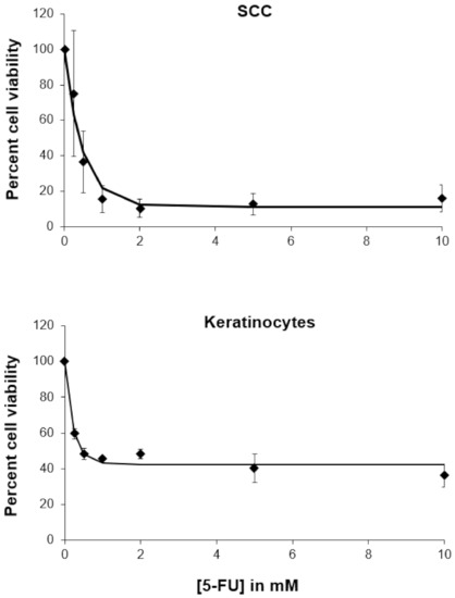 We then tested the toxicity of 5-FU toward these cell lines. Levy et al. determined that a total of 2.2% of 5-FU in a 5% 5-FU formulation is absorbed [35]. From this, we estimated what the concentration of 5-FU released from 100 mg of gel would be. This concentration was approximately 0.5 mM. We decided to test the doses below and above this estimate. When the cell studies were performed under the same conditions as the aforementioned PEITC carbomer gel studies (i.e., 30-min exposure time and a 24-h recovery), 5-FU at concentrations of up to 5 mM did not significantly decrease viability in either cell line (in Supplementary Materials). It was previously shown that 24-h exposure to 5-FU had no effect on either SCC-25 or human epidermal cells [36]. Thus, a 48-h continuous exposure study was performed in the absence of FBS (Figure 6). The IC50 values of 5-FU against SCC-25 cells and keratinocytes were both approximately 0.4 mM after a 48-h exposure. A decrease in viability over 48 h is most likely due to 5-FU interfering with the S phase of the cell cycle [36].