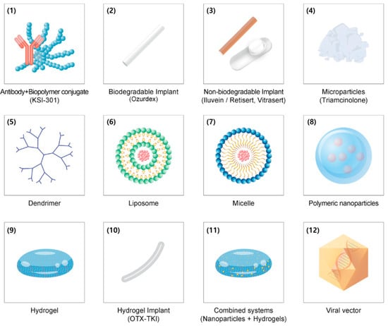 Schematic depicting the latest advancement in multiple ocular drug delivery systems: (1) Antibody+Biopolymer conjugate, (2) Biodegradable intravitreal implant, (3) Non-biodegradable intravitreal implant, (4) Triamcinolone acetonide microparticles, (5) Dendrimer, (6) Liposome, (7) Micelle, (8) Polymeric nanoparticles, (9) Hydrogel, (10) Hydrogel implant, (11) Combined systems, and (12) Viral vector.