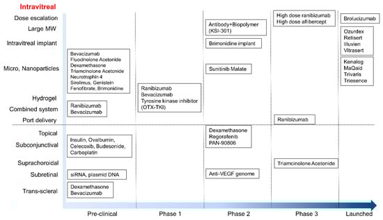 The topical route is a very efficient administration route for the treatment of anterior segment diseases. However, because of multiple ocular barriers, such as tear drainage, cornea, conjunctiva, and blood-aqueous barrier, it is considered significantly inefficient for posterior segment diseases. Nevertheless, because eye drops are more convenient to administer via the topical route than others, researchers have focused on developing topical formulations to treat retinal diseases. Loftsson et al. and Sigurdsson et al. previously designed dexamethasone-cyclodextrin complexes for topical drug delivery to the posterior segments of the eye [,]. Recently, topical regorafenib, a multikinase inhibitor used to treat neovascular AMD, was investigated in an open-label phase 2 clinical trial (DREAM; NCT02222207) to determine its efficacy []. By week 12, 21 (41%) of the 51 subjects required intravitreal ranibizumab rescue due to ocular treatment-emergent adverse events. As a result, the researchers terminated the clinical trial and suggested that the trial’s failure was due to insufficient exposure of the posterior segment to the topically administered drug. Another topical agent developed by PanOptica (Mount Arlington, NJ), PAN-90806, is a tyrosine kinase inhibitor of VEGF-A and PDGF. Previously, a phase 1/2 clinical trial (NCT03479372) was performed with treatment-naïve neovascular AMD patients [] who were administered eye drops (2, 6, and 10 mg/mL) daily for 12 weeks. Each week, the need for rescue intravitreal injections was evaluated. Based on the study findings, no rescue injections were required for 51% of the participants. Moreover, improved visual outcomes were observed in 88% of patients in the no rescue group [].