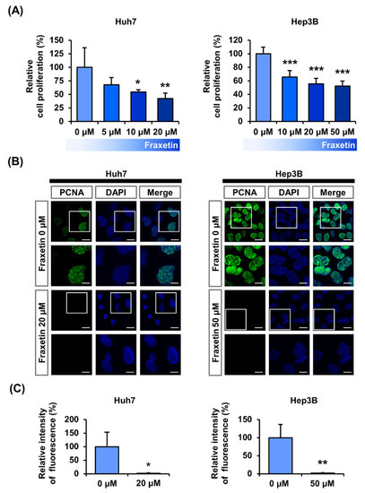 Antiproliferation effects of fraxetin in human hepatocellular carcinoma. (A) Cell proliferation of Huh7 and Hep3B in response to various concentration of fraxetin (0, 5, 10, and 20 or 0, 10, 20, and 50 μM). Average values of triplicated data converted to relative ratio values. (B) Confocal images of Huh7 and Hep3B cells. Green fluorescence indicates PCNA and blue fluorescence indicates DAPI. DAPI stained nuclei for co-localization. Scale bars: 20 μm. (C) Relative fluorescence intensity between vehicle and fraxetin treatment (20 μM or 50 μM). Asterisk marks indicate significant levels between vehicle- and fraxetin-treated cells (* p < 0.05, ** p < 0.01, and *** p < 0.001).