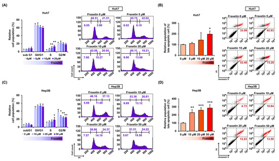 Next, we investigated the effect of fraxetin on cell cycle arrest in HCC cells using PI staining. Fraxetin treatment (0, 5, 10, 20, and 50 μM) gradually increased the relative population of S phase cells in both cell lines (Figure 2A,B). Moreover, fraxetin gradually decreased the G2/M cell population in Hep3B cells (Figure 2B). Next, we stained fraxetin-treated Huh7 and Hep3B cells with annexin V and PI to investigate apoptosis induction (Figure 2C,D). Fraxetin increased the number of late apoptotic cells in Huh7 and Hep3B in a dose-dependent manner. The late apoptotic cell populations of Huh7 and Hep3B cells increased to 197% (p < 0.05) and 285% (p < 0.001), respectively, compared to vehicle-treated cells. In short, fraxetin induced cell cycle arrest and apoptosis in Huh7 and Hep3B cells.