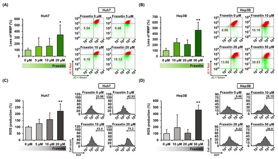 We evaluated the effects of fraxetin on mitochondrial function by monitoring the MMP (∆ψ) and the generation of ROS in HCC cells. Fraxetin depolarized MMP in Huh7 and Hep3B cells (Figure 3A,B). At 20 µM in Huh7 cells, fraxetin increased the relative MMP loss ratio by 3.5-fold (p < 0.05), whereas at 50 µM in Hep3B cells, it increased by 4.6-fold (p < 0.01). Besides, 20 µM of fraxetin increased the production of ROS by 221% in Huh7 cells (p < 0.01), while 50 µM increased it by 460% in HEP3B cells (p < 0.01) compared to vehicle-treated cells (Figure 3C,D). These results show that fraxetin induces mitochondrial dysfunction and disrupts the oxidative stress-buffering system.