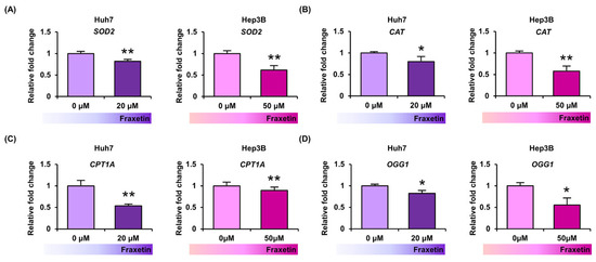 Effects of fraxetin on oxidative stress-related gene expression. (A–D) Quantitative analysis of mRNA levels of SOD2 (A), CAT (B), CPT1A (C), and OGG1 (D) normalized relatively to the house-keeping gene GADPH. RNA was extracted after fraxetin treatment (20 μM or 50 μM) for 24 h on Huh7 and Hep3B cells. Asterisks indicate the significance levels of comparisons between vehicle- and fraxetin-treated cells (* p < 0.05 and ** p < 0.01).