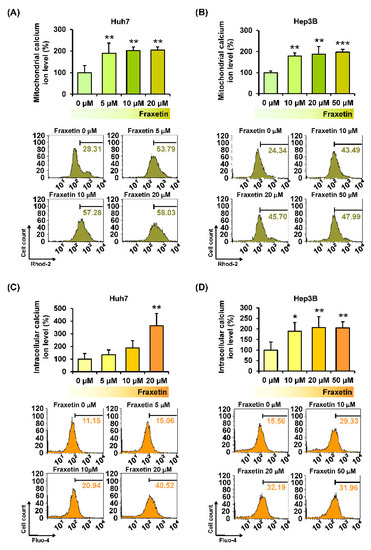 Effects of fraxetin on calcium homeostasis in the mitochondrial matrix and cytoplasm of Huh7 and Hep3B cells. (A,B) Accumulation of calcium in the mitochondrial matrix. The right part of the peaks were measured and represented as a percentage-ratio in the bar graphs. (C,D) Intracellular calcium concentrations. Asterisks indicate the significance levels of comparisons between vehicle- and fraxetin-treated cells (* p < 0.05, ** p < 0.01, and *** p < 0.001).