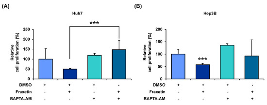 Regulatory effects of calcium ion on the proliferation of human HCC cells. (A,B) Relative proliferation of Huh7 (A) and Hep3B (B) cells treated with fraxetin and with or without BAPTA-AM for 48 h. Asterisks indicate the significance levels of comparisons between the vehicle and fraxetin with BAPTA treatments (*** p < 0.001).