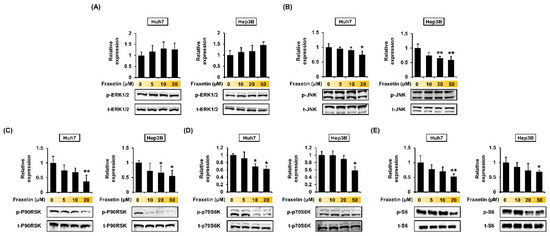 Regulation of mitogen activated protein kinase (MAPK) and phosphoinositide 3-kinase (PI3K) signaling pathways by fraxetin in hepatocellular carcinoma cells. (A–E) Phosphorylation of ERK1/2 (A), JNK (B), P90RSK (C), P70S6K (D) and S6 (E) in response to increasing doses of fraxetin. Asterisks indicate the significance levels of comparisons between vehicle-treated cells and fraxetin-treated cells (* p < 0.05 and ** p < 0.01).