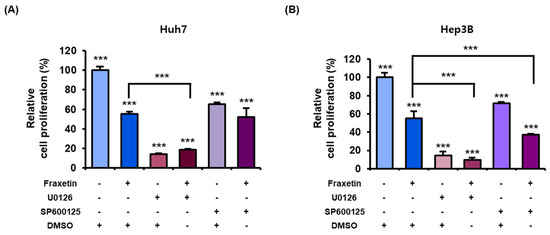 Synergistic effects of fraxetin with MAPK inhibitors on the proliferation of HCC cells. (A,B) Relative proliferation of cells treated with 20 μM of MAPK inhibitors (U0126: ERK1/2 inhibitor; SP600125: JNK MAPK inhibitor) and fraxetin (20 μM in Huh7 or 50 μM in Hep3B) for 48 h in HCC cells, then each cell proliferation was measured. Asterisks indicate the significance levels of comparisons between the control and treated groups, and fraxetin with or without MAPK inhibitors (*** p < 0.001).