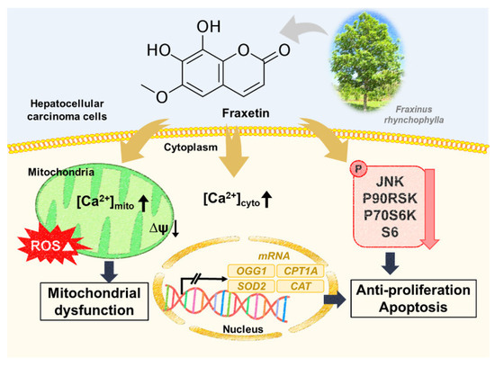 Therefore, we investigated the ability of fraxetin to (1) inhibit cellular proliferation, (2) induce cell cycle arrest and apoptosis, (3) hamper mitochondrial function and calcium homeostasis, (4) regulate gene transcription, and (5) dysregulate intracellular signaling pathways, mitogen activated protein kinase (MAPK) and phosphoinositide 3-kinase (PI3K), in HCC. Our results suggest that fraxetin is a potentially useful chemotherapeutic agent or supplementation for HCC.