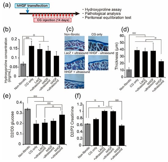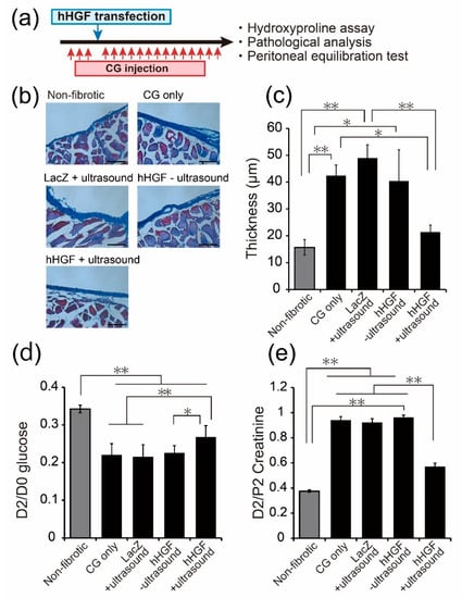 3.2. Prevention Effects of Sonoporation-Mediated hHGF Transfection on the Progression of CG-Induced Peritoneal Fibrosis