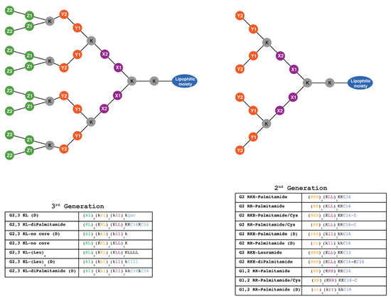 Schematic representation of 2nd and 3rd generation lipophilic peptide dendrimers synthesized using solid-phase chemistry. One-letter code is used to label amino acids forming the dendritic structure. The lipophilic moiety is composed of C12 (Dodecanoic acid), one or two C16 (Hexadecanoic acid), with or without C (Cysteine), or composed of four L (Leucine). K (Lysine) is the branching point for building higher generations, as well as constituting part of the structure and the cationic charge along with, R (Arginine), H (Histidine), and L (Leucine) which are the building units that constitute the rest of the structure. X1, X2, Y1, Y2, Z1, Z2 represent the position of the amino acid with the matching color code (X1 and X2: amino acids in the first layer; Y1 and Y2: amino acids in the second layer; Z1 and Z2: amino acids in the third layer). Capital and small letters indicate L and D stereochemistry of the amino acids, respectively. All dendrimers contain 2 amino acids in the outer layer, except (G2 RKH-Palmitamide, G2 RKH-Palmitamide/Cys, G2 RKH-Palmitamide (D), G2 RKH-Lauramide, and G2 RKH-diPalmitamide) that contain three amino acids. Dendrimers: G 2,3 KL-diPalmitamide, G 2,3 KL-diPalmitamide (D), G 2,3 KL-(Leu)4, and G 2,3 KL-(Leu)4 (D) were denoted as MH13, DMH13, MH18 and DMH18, respectively, in a previous publication [34].