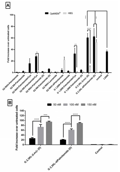 For the 3rd generation peptide dendrimer (Figure 2A), G 2,3 KL-(Leu)4 (D), which has an amino acid hydrophobic core, increased luciferase activity up to 61-fold, when formulated in OptiMEM®, but not in HBG (only 10-fold over untreated). It is known that the conformational state of the dendrimers can be affected by the formulating buffer and buffer salt concentration [41,42], thus, affecting complexation, stability, and transfection ability. However, for the G 2,3 KL-diPalmitamide (D) having two C16 lipid tails attached to the core, the level of increase of luciferase activity was comparable in OptiMEM® and HBG buffers (57- and 52-fold, respectively). Both dendrimer formulations (G 2,3 KL-(Leu)4 (D) in OptiMEM®, and G 2,3 KL-diPalmitamide (D) in OptiMEM® and HBG) displayed significantly higher transfection efficiency in comparison to L2000. (All the results were summarized in a table format (Tables S1 and S2) and added to Supplementary Materials).