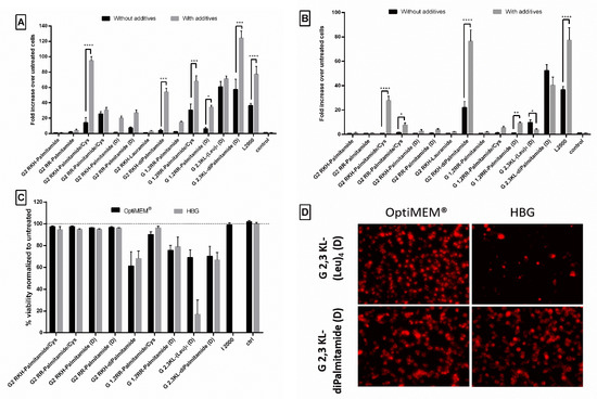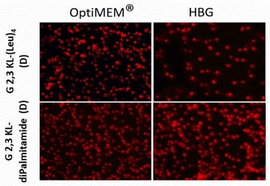 For the rest of the study, OptiMEM® medium was used for G 2,3 KL-(Leu)4 (D) formulation and HBG buffer was preferred for G 2,3 KL-diPalmitamide (D) formulation.