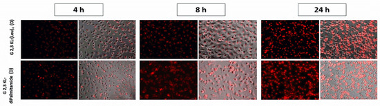 Splice-switching activity and cellular uptake at different time points (4, 8, and 24 h) for the lipid-conjugated peptide dendrimers G 2,3 KL-(Leu)4 (D) and G 2,3 KL-diPalmitamide (D) were investigated. As shown in Figure 4, similar uptake behavior was noticed for both dendrimers at the corresponding time points. Meanwhile, for the activity, G 2,3 KL-diPalmitamide (D) shows slightly higher luciferase signals at early time points (Figure 5). This might imply a faster endosomal escape or nuclear entry rate compared to G 2,3 KL-(Leu)4 (D). The difference in the lipophilic moieties attached to the core (alkyl chain in G 2,3 KL-diPalmitamide (D) versus leucine residue in G 2,3 KL-(Leu)4 (D)) is a contributing factor and was previously demonstrated for siRNA [34].
