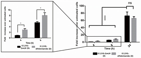 Luciferase activity as a measure of splice-correction levels of the lipophilic peptide dendrimers (G 2,3 KL-(Leu)4 (D) and G 2,3 KL-diPalmitamide (D)) at different time points. Dendrimers were formulated in OptiMEM® and HBG, respectively. Luciferase activity levels were measured after HeLa Luc/705 transfection with the dendrimers in serum-containing media. Each bar represents the mean with the SEM of at least three independent experiments performed in triplicate (n ≥ 3). p-values were calculated by two-way ANOVA test, and the statistical difference was measured using post hoc Fisher’s LSD test. (ns: non-significant, * p ≤ 0.05, and **** p ≤ 0.0001).