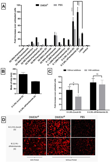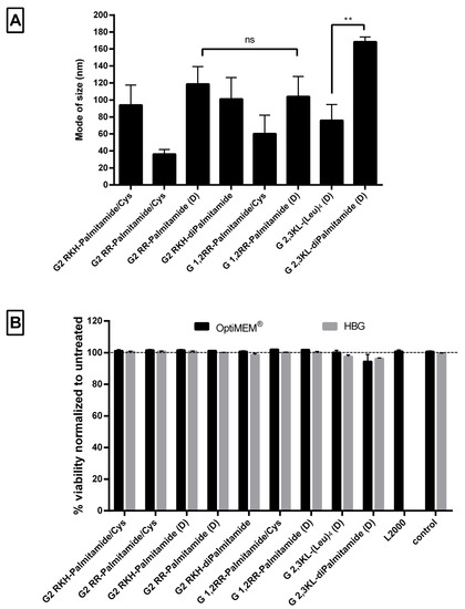 Formulating G 2,3 KL-(Leu)4 (D) in DMEM® increased the level of luciferase up to 72-fold and up to 99-fold for G 2,3 KL-diPalmitamide (D), while up to 49- and 21-fold for G 2,3 KL-(Leu)4 (D) and G 2,3 KL-diPalmitamide (D) when formulated in PBS, respectively, compared to untreated cells (Figure 10A). These results reemphasized the role of the formulating buffer and salt concentration on the configuration state of the dendrimers, thus affecting complexation, stability, and transfection ability [41,42]. The mode of size of the formed nanoparticles was around 200 nm for G 2,3 KL-(Leu)4 (D) and around 120 nm for G 2,3 KL-diPalmitamide (D) (Figure 10B). It seems that G 2,3 KL-diPalmitamide (D) complexes formulated in DMEM® were smaller than those formulated in HBG (Figure 6A).