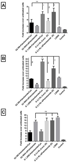 To check whether the effect is related to amino acid chirality, two control dendrimers with L amino acid (G 2,3 KL(Leu)4 and G 2,3 KL-diPalmitamide) were synthesized (Figure 1). The activity of G 2,3 KL-(Leu)4 in L configuration almost disappeared, meanwhile for G 2,3 KL-diPalmitamide (D) the activity was only slightly reduced in L configuration (Supplementary Figure S1). Our data follow the same trend and findings as previously published studies in which the amino acid chirality did affect the siRNA and DNA delivery [34,35,36].
