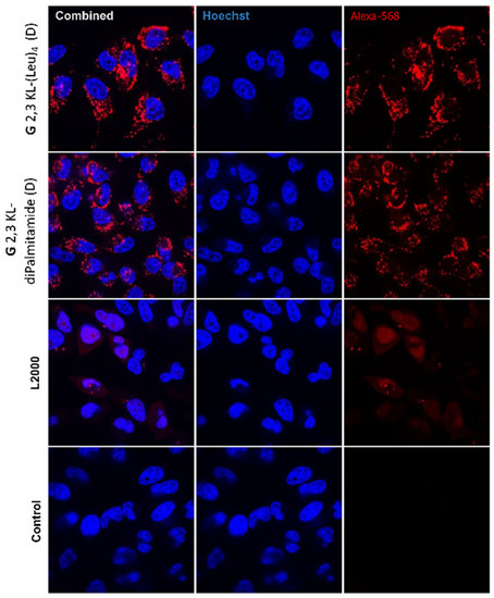 Hoechst dye highlighted the nucleus, whereas the ON was visualized through its conjugation to Alexa-568. The combined images showed the distribution of the ON within the cells (Figure 9). Confocal images indicated higher nuclear uptake in L2000 compared to the lipophilic peptide dendrimers. However, ON nuclear uptake does not always relate with activity; signals corresponding to nuclear uptake of ON within dendrimers could be too weak to be detected.