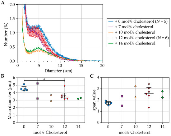(A) Number weighted size distribution, (B) number weighted mean diameter (μm), and (C) span value of indirect DSPC-based microbubbles with cholesterol in a range from 0 to 14 mol%. In B and C, each symbol represents one batch of microbubbles; jittering was applied to avoid overlapping. The overlaid black lines represent the median and interquartile range. Statistical significance is indicated with * p < 0.05.