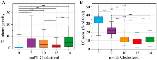 (A) Parts classified as inhomogeneity (%) in the ligand distribution, and (B) size of the LC area (% of total surface area) of indirect DSPC microbubbles without cholesterol (N = 58), with 7 mol% (N = 34), 10 mol% (N = 40), 12 mol% (N = 61), and with 14 mol% (N = 45) cholesterol in the coating. Boxplots show the median and interquartile range with whiskers from minimum to maximum. Statistical significance is indicated with * p < 0.05, ** p < 0.01, or *** p < 0.001.
