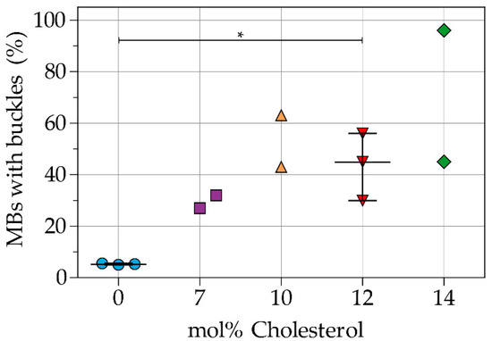 Percentage of microbubbles (MBs) with buckles per batch of indirect DSPC-based microbubbles without cholesterol and with 7, 10, 12, or 14 mol% cholesterol. Each symbol represents one batch of microbubbles. Overlaid black lines represent the median and interquartile range. Statistical significance is indicated with * p < 0.05.
