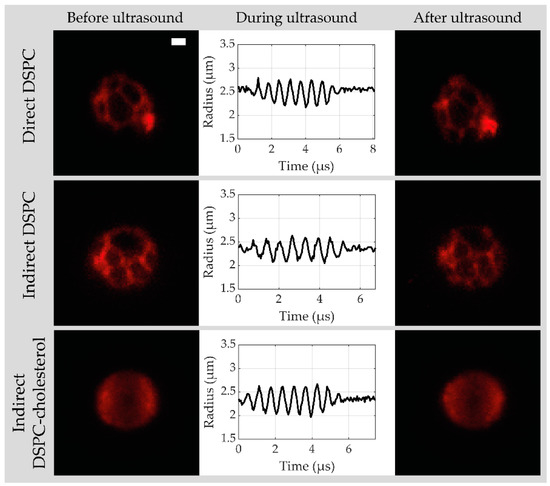 Maximum intensity projections of confocal z-stack from direct DSPC, indirect DSPC, and indirect DSPC-cholesterol (12 mol%) microbubbles with the LE phase in red, before and after ultrasound, with the microbubble radius as a function of time obtained from the Brandaris 128 ultra-high-speed recordings during ultrasound (50 kPa peak negative pressure (PNP), 1.6 MHz). Scale bar is 1 µm and applies to all images.