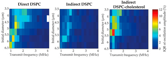 Figure 7 illustrates the variability in acoustical response within the three types of microbubbles. The variability was quantified as the interquartile range (IQR) of the oscillation amplitude from different microbubbles of the same size at the same transmit frequency (N > 3 per bin). The maximum and median IQR values for each type of microbubble are listed in Table 1. Indirect DSPC-cholesterol microbubbles had the highest maximum IQR, while direct DSPC microbubbles had the highest median IQR. Overall, indirect DSPC microbubbles exhibited the lowest variability in acoustical response.