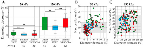 (A) Diameter decrease (%) for direct DSPC (green), indirect DSPC (blue), and indirect DSPC-cholesterol (red, 12 mol% cholesterol) microbubbles at 50 kPa (left panel) and 150 kPa (right panel). Boxplots represent the median and IQR. ** p < 0.01. *** p < 0.001. (B,C) Maximum oscillation (%) as a function of diameter decrease (%) for direct DSPC (green), indirect DSPC (blue), and DSPC-cholesterol (red, 12 mol% cholesterol) microbubbles at 50 kPa (B) and 150 kPa (C). Gray areas indicate the range of maximum oscillation values reached by all three types of microbubbles.